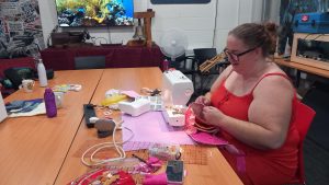 “Uptake has been really popular. We are based in Yaxley – the Yaxley Farcet Men Shed and the Hobby Hub, but anyone in Cambridgeshire and Peterborough can come. We welcome all ages, all abilities and all backgrounds, we work with a local deafblind support service; they asked me to pour nuts and bolts, for the people they support, into a box to sort – they like the tactile nature of this task. We also have loads of local support. Local businesses are supporting us with table cloths, drinks, linen fabric and we distribute these products out in the community.