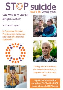 Our latest campaign in November 2025 and beyond is called ‘Are you sure you’re alright, mate?’ and highlights that in Cambridgeshire and Peterborough, the suicide rate was highest for men aged 50-54. This new campaign encourages people to check in on their friend, colleague, family member, neighbour, and anyone in their community. The campaign aims for people to ask, and ask again. Sometimes asking how someone is can make all the difference.