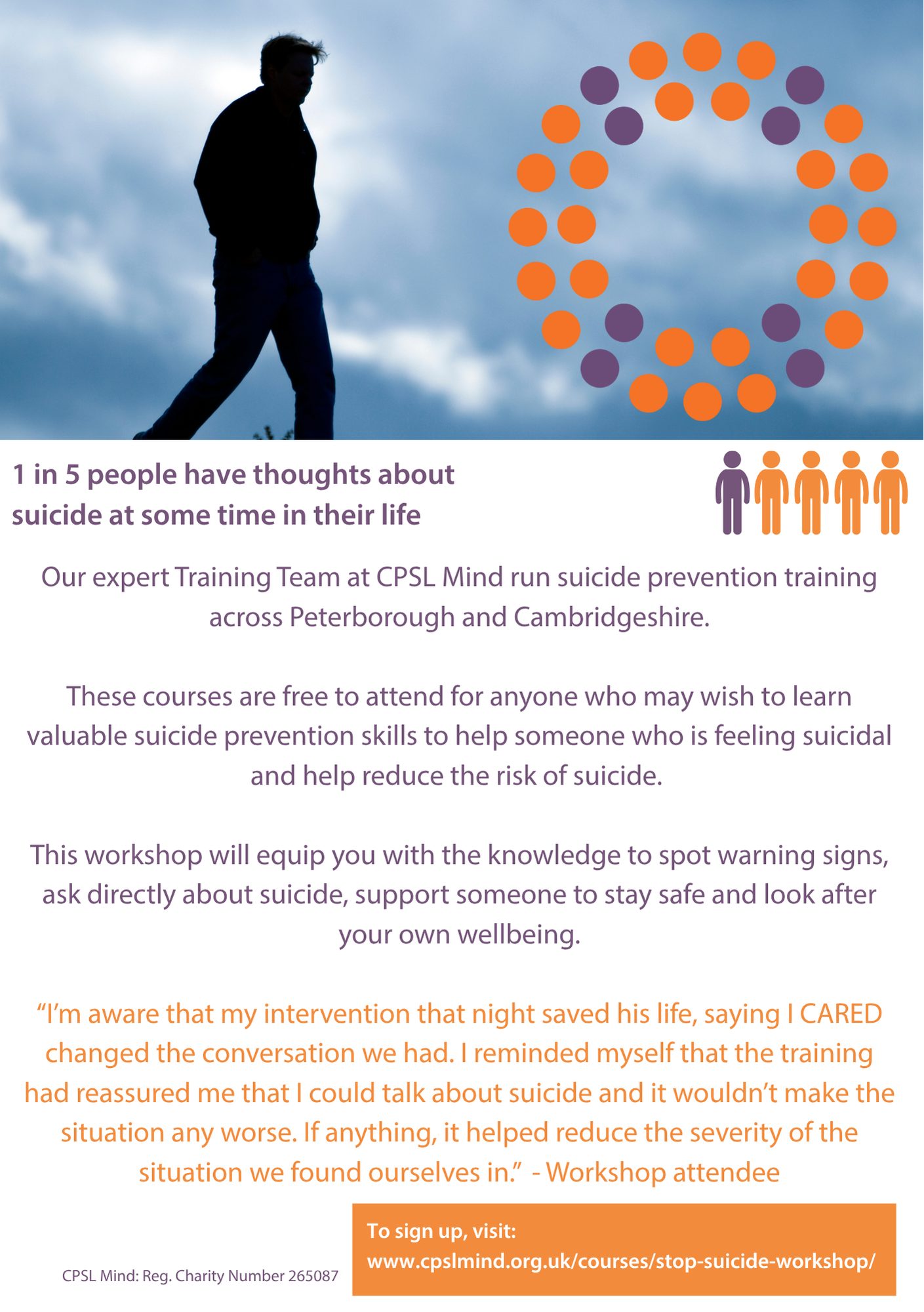 It is led by the charity Cambridgeshire, Peterborough and South Lincolnshire Mind (CPSL Mind) and supported by local NHS and Public Health teams. It involves general awareness raising about suicide, specialist training for non-mental health professionals working / volunteering within our communities public campaigns to encourage people to sign up to training and to end stigma.