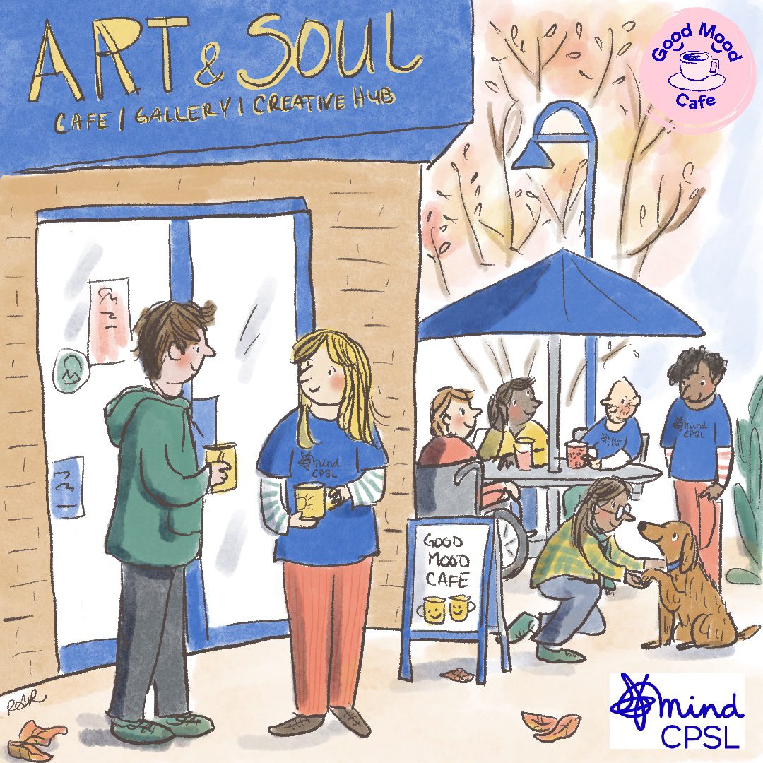 CPSL Mind’s first Good Mood Cafe to launch was at the Art & Soul Cafe on New Street in St Neots (now named The Priory Centre). Local Cambridge-based artist, Roxana de Rond, is working with CPSL Mind to create a series of local illustrations to showcase CPSL Mind’s services and local communities. The Good Mood Cafe illustration (pictured below) is the first to be shared in the series.